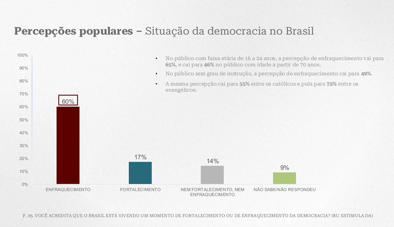 Diante da pergunta “Você acredita que o Brasil está vivendo um momento de fortalecimento ou enfraquecimento da democracia?”, os resultados foram contundentes: