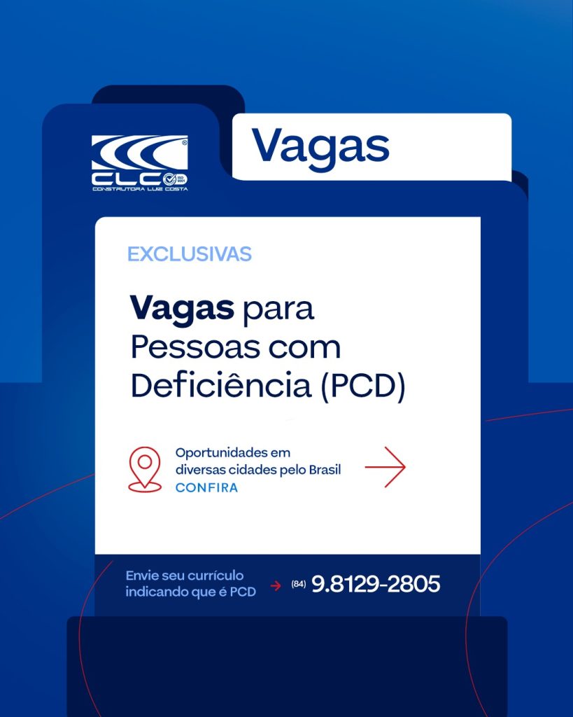 A CLC Construtora está com vagas abertas para Pessoas com Deficiência (PCD) em diversas cidades do Brasil: