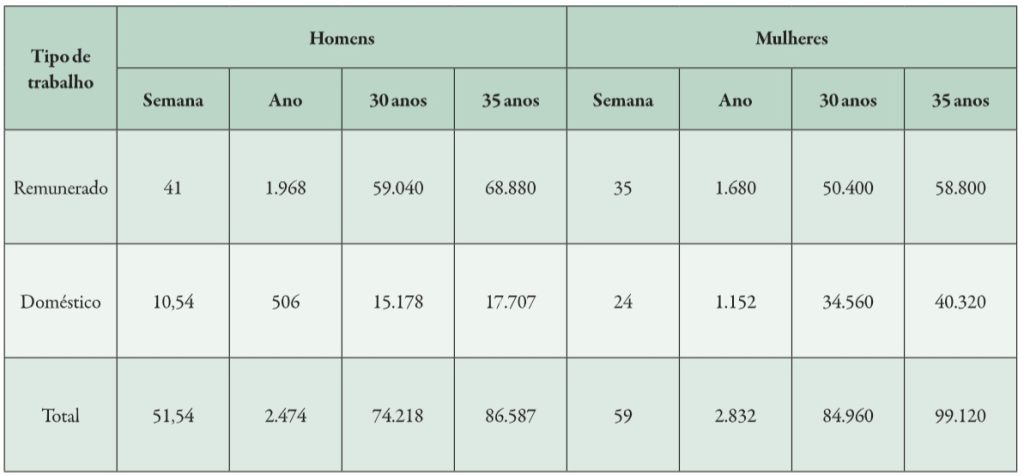 A soma das duas jornadas revela que, em uma semana, as mulheres trabalham, em média, 59 horas, enquanto os homens trabalham 51,5 horas. Essa diferença de 7,5 horas semanais se amplia quando projetada no tempo, de maneira que, em um ano, as mulheres trabalham 358 horas a mais. De acordo com a pesquisa, se considerada uma jornada diária de 12 horas, esse valor representa 30 dias úteis a mais de trabalho por ano. Em uma métrica de longo prazo, o estudo estima que, em 35 anos, as mulheres acumulam um volume de horas trabalhadas equivalente a 40 anos na trajetória masculina.