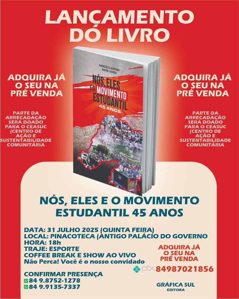 A obra já está disponível em pré-venda, em edição especial e tiragem limitada. Os exemplares podem ser reservados pelos números: (84) 9.8752-1278 ou (84) 9.9135-7337.
