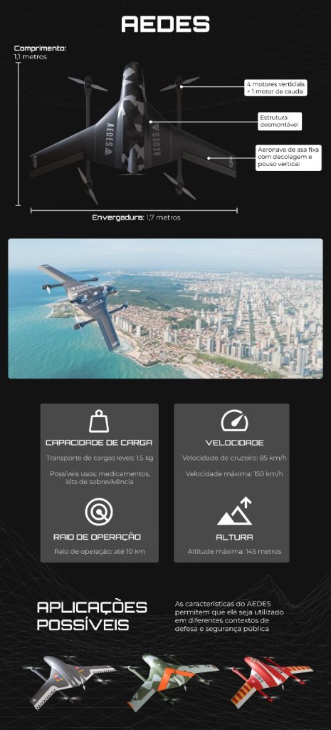 O AEDES também conta com equipamento projetado para percorrer grandes áreas em pouco tempo, com capacidade de decolagem vertical e voo horizontal, o que permite sua operação mesmo em ambientes urbanos com obstáculos, como postes, prédios e árvores grandes. Com essas características, a nova versão do drone surge com amplas possibilidades de aplicação, que podem ir além do âmbito universitário. Exemplo disso é a capacidade de reforçar, em diferentes locais da cidade, o policiamento ostensivo comum, quando a simples presença visual e sonora do drone inibe ações criminosas em áreas sensíveis.