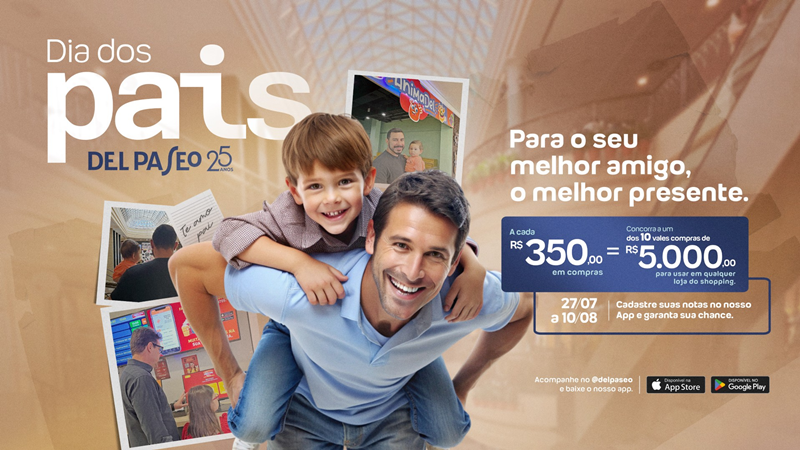 O Shopping Del Paseo valoriza os laços que fortalecem a família e convida seus clientes a celebrar o Dia dos Pais com uma campanha que traduz cuidado em presente. De 28 de julho a 10 de agosto, a cada R$ 350 em compras, os clientes ganham um número da sorte para participar do sorteio de 10 vales-compra de R$ 5 mil, que podem ser usados em qualquer loja do shopping. Compras realizadas nos finais de semana geram cupons em dobro.