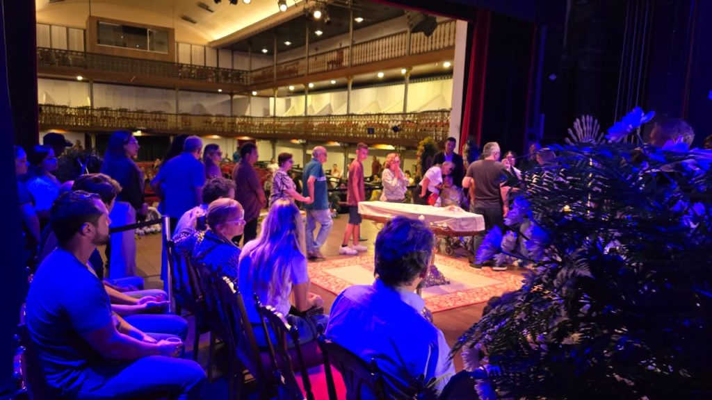 Em um momento de profunda emoção, o caixão contendo o corpo da atriz adentrou o teatro pela porta da frente, às 22h40, sendo carregado por amigos produtores culturais. A entrada foi marcada por uma salva de palmas unânime, um último e comovente aplauso que ecoou pela casa de espetáculos, misturado a lágrimas e gritos pelo seu nome. O caixão foi então conduzido ao palco. Por aproximadamente dez minutos, a cortina se fechou, reservando um momento de intimidade e despedida aos familiares. Após esse período, a cortina reabriu, permitindo que admiradores e colegas se aproximassem para o adeus final.